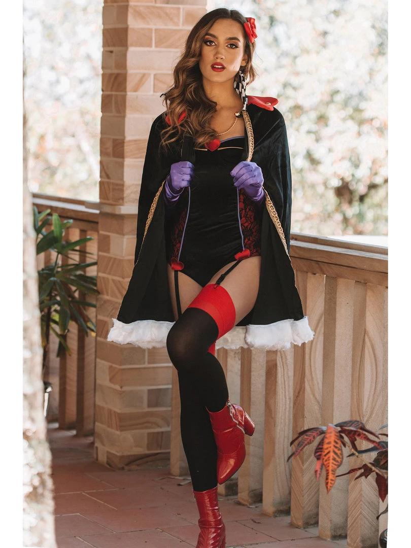 This Classic Evil Villain Costume includes a black and red lace contrast velvet sweetheart bodysuit with garter straps, matching black velvet cape with contrasting collar and satin feel purple gloves.