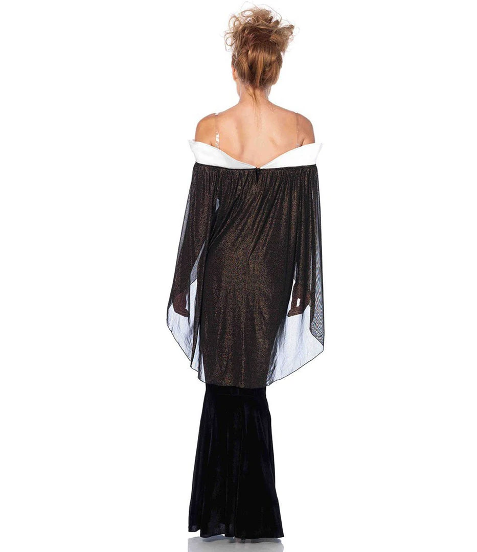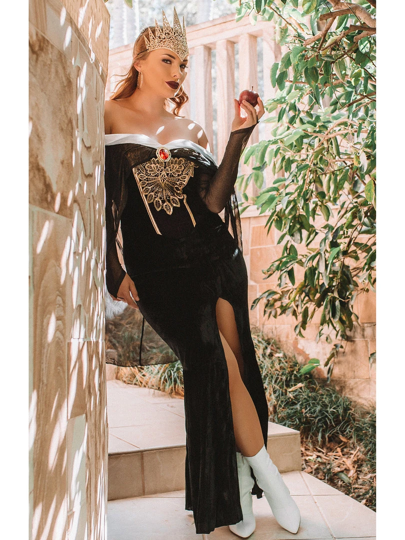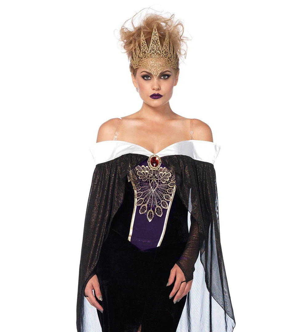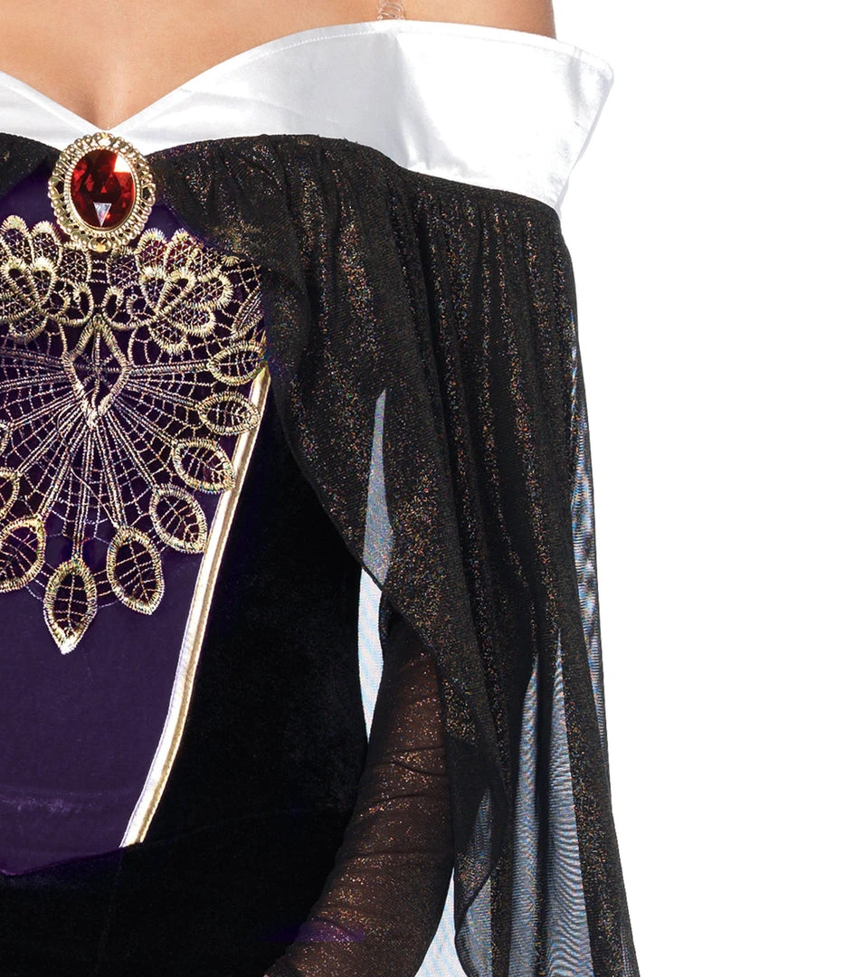 This women’s costume comes with an eye-catching floor-length long black dress made from velvet stretch material with a sexy thigh split, off the shoulder sleeves with white collaring made from a satin feel fabric to show off your dazzling décolletage and attached shimmering sheer capelet, deep purple panelling on the bodice with gold trimming and gold stitch embroidery detailing and faux gem and tall gold crown, with ornate laser-cut detailing.
