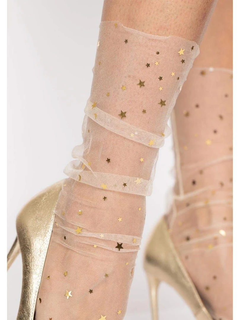 These delicate socks feature a slouchy tulle design, adorned with glistening stars and moons against cream coloured sheer tulle.