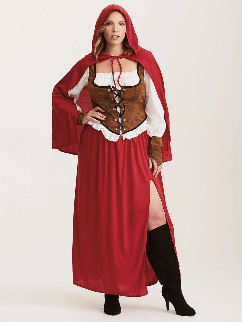 This high-quality Plus Size Red Riding Hood costume includes a one-piece dress with a back zipper and super sexy thigh-high slit to make you look banging! The bodice of the dress has a brown faux suede corset-style feature with black ribbon lace-up, and white cheesecloth fabric long sleeves, complemented with faux suede brown wrist cuffs with velcro closure. This costume is topped off with a super cute red hooded cape which ties up around the neck. (All the better to hide you from the wolf!).
