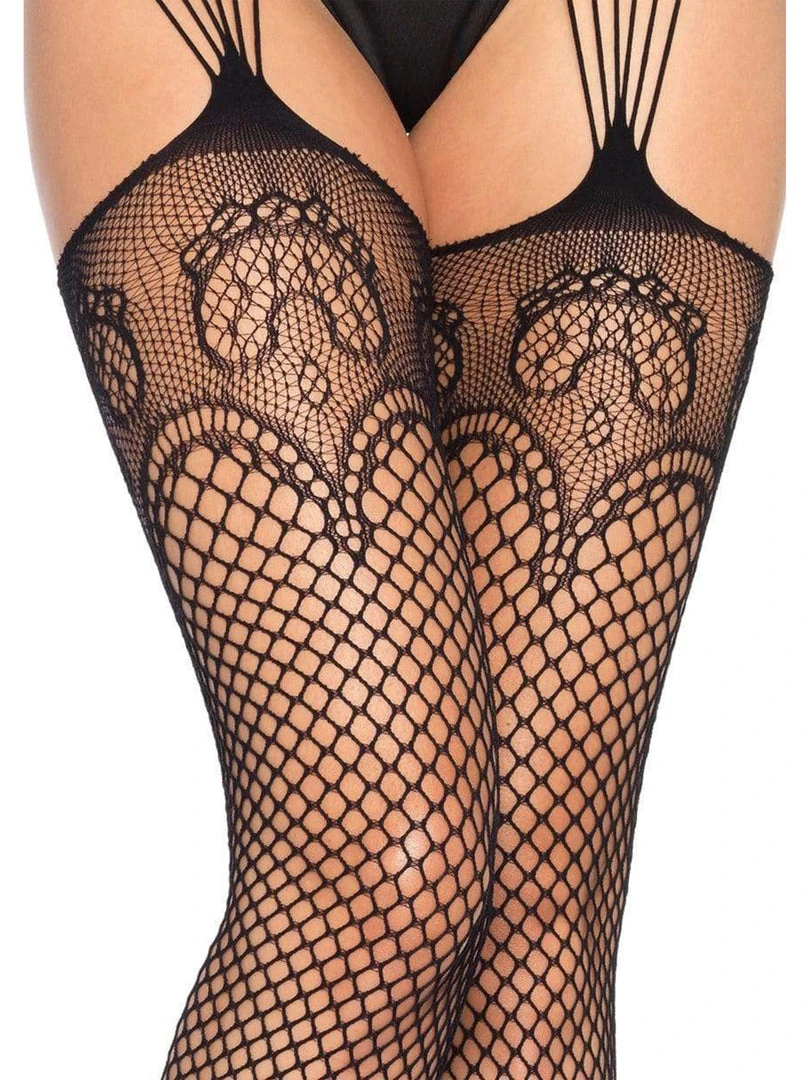 Shine under the spotlight in these sexy fishnet thigh-high stockings with floral lace details and an attached multi-strand suspender garter belt.