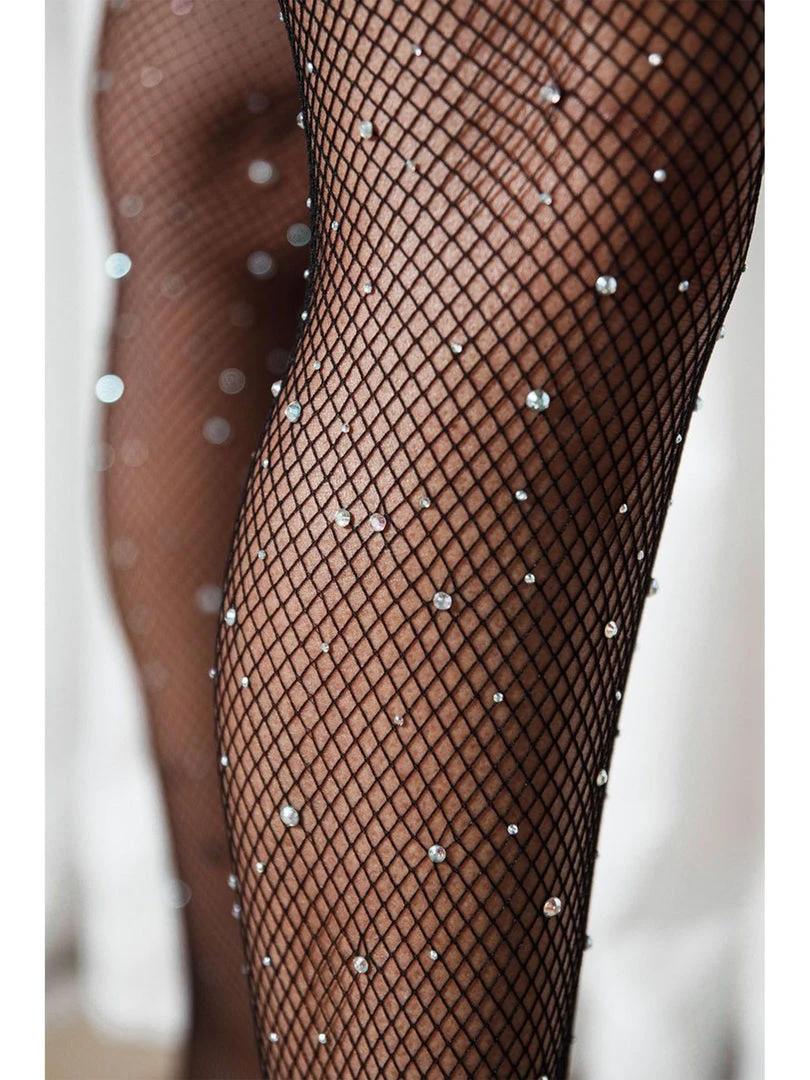 Shine bright like a diamond in these opulent black fishnet tights with all-over rhinestone embellishments!