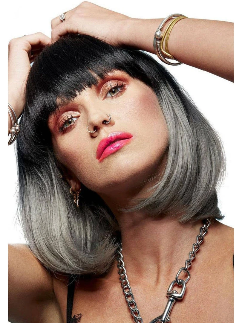 - This 30cm ombre wig is a straight bob cut with black roots and grey ends.